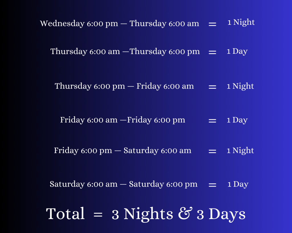 Saturday at 6 pm to Sunday at 6 am = another 12 hours—one night.