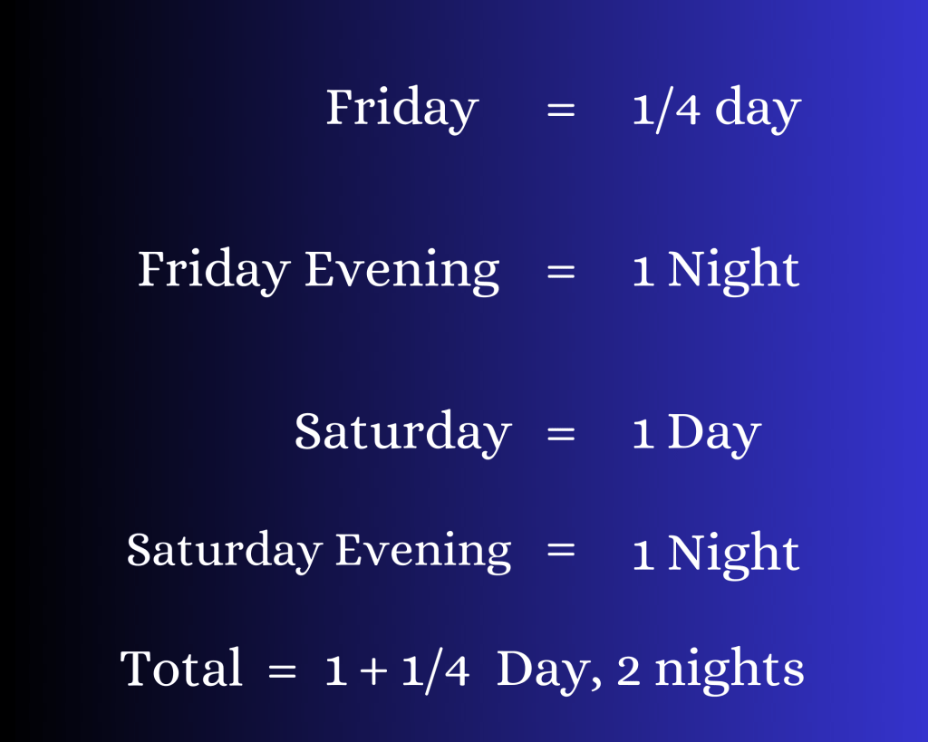 Friday at 6 pm to Saturday at 6 pm = 24 hours—one night and one day.