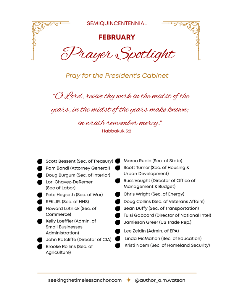 I’m just popping in with a quick note to all those who are joining in the Semiquincentennial Prayer Challenge. It came to my attention that it would be useful to have a PDF prayer list of all the President’s Cabinet members. With that in mind, I have created a prayer sheet that you can print out, keep in your Bible, post on your refrigerator, or tuck into your purse so that you can remember our Presidential Cabinet in prayer throughout your day.